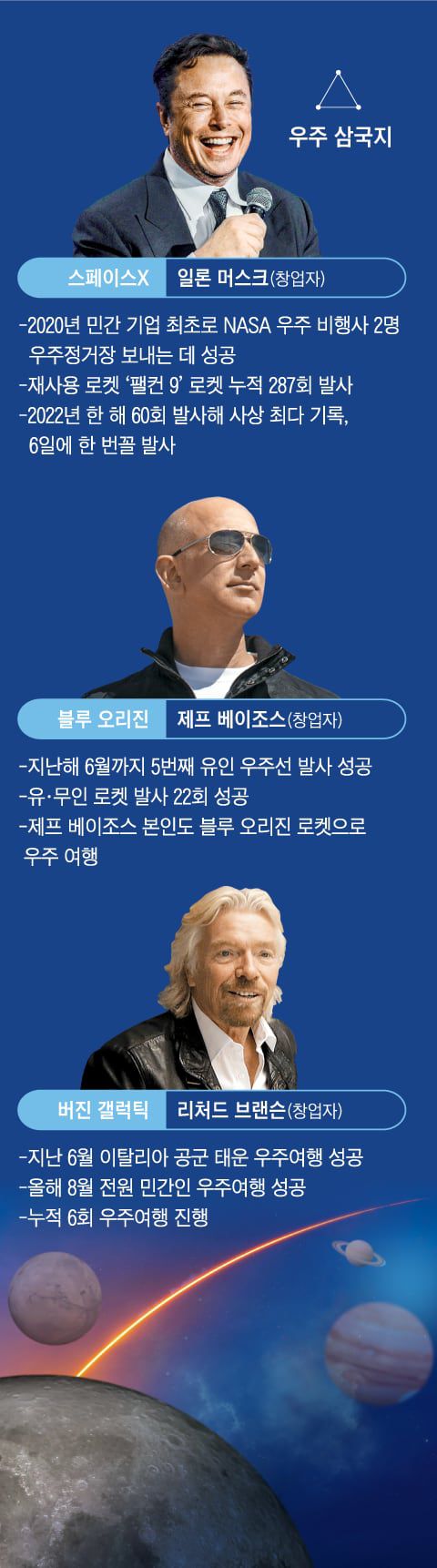 민간이 주도해서 우주를 개발하는 ‘뉴 스페이스’ 시대가 스페이스X, 블루 오리진, 버진 갤럭틱 3강(强)의 치열한 경쟁 끝에 스페이스X의 압승으로 기울고 있다. 일론 머스크 테슬라 최고경영자(CEO), 제프 베이조스 아마존 창업자 및 리처드 브랜슨 버진그룹 회장 등 세 사람의 억만장자가 2000년대 초·중반 뛰어든 우주 사업이 기술력과 전략 차이로 20여 년 만에 성과가 뚜렷하게 갈리고 있는 것이다. 적수가 없어진 머스크 스페이스X CEO의 막강한 ‘우주 권력’에 대한 우려의 목소리도 커지고 있다.