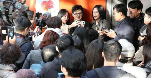 한동훈 법무부 장관이 지난달 17일 대구 수성구 스마일센터 방문 중 시민들의 요청으로 셀카를 찍고 있다. 대구=연합뉴스 |