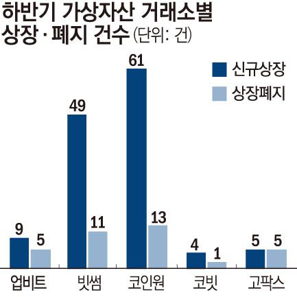빗썸은 올해 상반기에도 63종의 가상자산을 신규 상장해 5개 원화 거래소 중 가장 많은 가상자산을 상장했다. 지금까지 신규 상장한 가상자산을 합하면 112종에 달한다. 코인원은 상반기와 하반기 합쳐 78종이다. 같은 기간 업비트는 31종, 코빗은 10종, 고팍스는 8종이다.