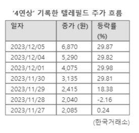 주가는 지난달 29일 18.38% 오른 것을 시작으로 30일 이후 4거래일 연속 상한가로 장을 마치며 단 일주일 만에 229.5% 치솟았다. 이에 거래소는 이날 텔레필드를 투자경고종목에 지정했다.
