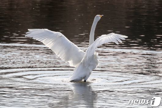 포근한 날씨가 이어진 5일 오전 대구 동구 금호강 안심습지에서 월동하는 천연기념물 큰고니가 따뜻한 햇볕을 쬐며 날갯짓하고 있다. 2023.12.5/뉴스1 ⓒ News1 공정식 기자 |