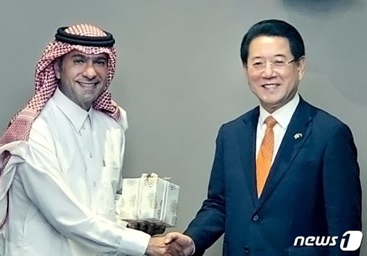 중동 아시아를 순방중인 김영록 전라남도지사가 4일(현지시간) 사우디아라비아 리야드에서 알-호가일 사우디아라비아 도시농촌주택개발부장관과 인사를 나누고 있다. (전남도 제공) 2023.12.5/뉴스1 |