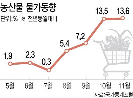 [세종=이데일리 조용석 기자] 이상기후와 작황부진의 여파로 11월 농산물 가격이 30개월 만에 전년대비 최대폭 상승했다. 국제유가가 안정세를 찾으면서 전체 헤드라인 물가지수는 떨어졌지만 장바구니 물가불안은 여전한 셈이다. 정부는 종료예정이던 농축수산물 할인지원을 예비비를 투입해 연말까지 연장하는 등 물가단속에 나섰다.
