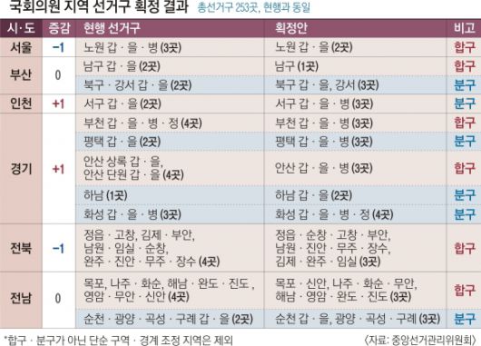 이에 서울과 전북에서 의석수가 1개씩 줄었고 인천과 경기에서 1석씩 늘었다. ‘서울 종로’와 ‘중구·성동갑·을’이 ‘종로 중구’와 ‘성동갑·을’로 조정되는 등 5개 시·도·구 내 구역도 바뀌었다. 또 15개 자치구·시·군 내 경계도 조정됐다.