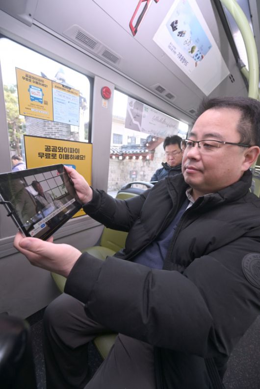 5일 서울 광화문 국립고궁박물관 앞에서 열린 시내버스 공공와이파이 시연회에 참여한 한 시민이 공공와이파이를 이용해 동영상을 보고 있다. 과학기술정보통신부와 SK텔레콤은 전국 2만 9100대 시내버스 공공와이파이를 기존 LTE에서 5G로 전환하는 사업을 이날 완료했다.