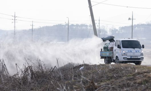 올겨울 첫 고병원성 조류인플루엔자(AI)가 발생한 5일 경기도 안성시 일죽면 일대 하천에서 방역차가 철새도래지에 대한 방역 작업을 하고 있다. 경기도는 지난 1일 고병원성 AI 위기 단계를 ‘주의’에서 ‘심각’으로 격상했다.