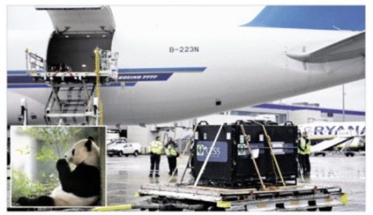 영국의 유일한 자이언트 판다 커플인 암컷 ‘톈톈’과 수컷 ‘양광’(작은 사진)이 4일(현지시간) 에든버러 공항에서 특수 제작 우리에 실려 중국 남방항공 보잉 777 화물기 탑승을 기다리고 있다. 2011년 12월부터 영국 에든버러 동물원에 살던 판다 커플은 코로나19 때문에 임대 기간(10년) 이상 영국에 머물다가 고향으로 돌아간다.