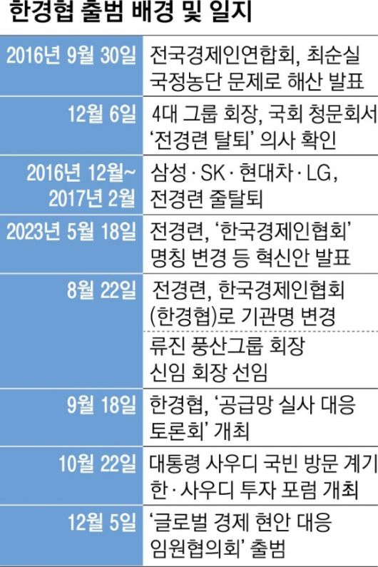 다만 전경련 시절의 중량감을 되찾기 위해서는 갈 길이 멀다. 한경협은 2016년 국정농단 사태 이후 4대 그룹(삼성·SK·현대차·LG그룹) 탈퇴 등의 곡절을 겪었다. 윤석열 정부 들어 대통령 해외 순방 동행에 복귀하는 등 과거 위상 회복에 나서고 있지만 이번 부산세계박람회(엑스포) 유치 활동만 하더라도 눈에 띄는 역할을 하지는 못했다.