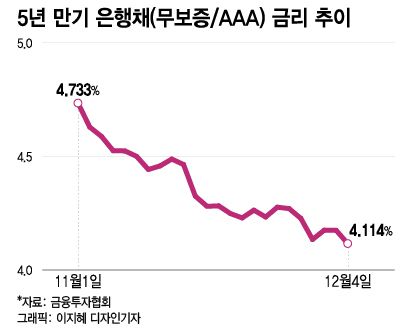 혼합형 주담대 금리가 하락한 것은 준거금리로 쓰이는 5년 만기 은행채의 금리가 최근 하락해서다. 은행채 5년물(무보증·AAA급)의 전날 평균 금리는 4.114%로 지난 6월7일 이후 6개월여 만에 최저치를 기록했다. 지난달 1일과 비교해 0.619%p 하락했다.