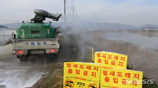 [용인=뉴시스] 김종택 기자 = 5일 경기도 용인시 백암면 청미천 일대에서 방역차량이 방역작업을 하고 있다. 최근 전남 고흥의 한 오리 농장에서 고병원성 조류독감 항원이 검출되자 경기도는 조류인플루엔자(AI) 위기 단계를 심각으로 격상, 방역에 총력전을 펼치고 있다. 2023.12.05. jtk@newsis.com |