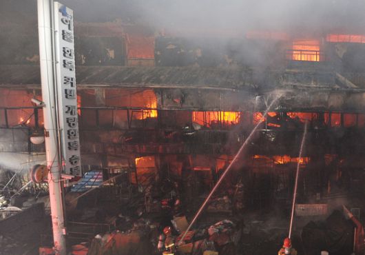 대구 중구 서문시장 4지구에서 화재가 발생해 소방관들이 불길을 잡고 있다. 소방당국에 따르면 현재 인명피해는 없으며 839개의 점포 중 500여개 이상이 피해를 입은 것으로 알려졌다. 2016.11.30/뉴스1 |
