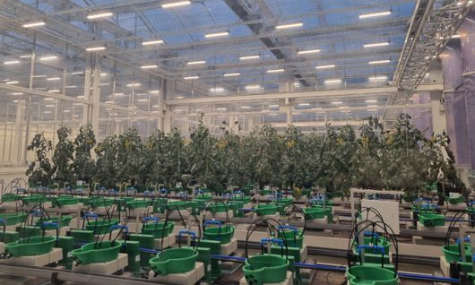 ‘AI 농부’가 키우는 토마토 네덜란드 바헤닝언대 연구소가 운영하는 스마트팜 연구소 엔펙(NPEC)의 유리 온실에서 자라고 있는 토마토 나무들. 나무 앞에 놓인 초록색 화분에 손잡이처럼 달린 검은색 줄은 작물에 물을 주는 관수선이다. 화분 밑의 하얀색 받침대는 화분에서 자라는 작물의 무게를 잴 수 있어서, 화분에 심은 작물의 물 흡수량을 측정해 데이터화한다. |