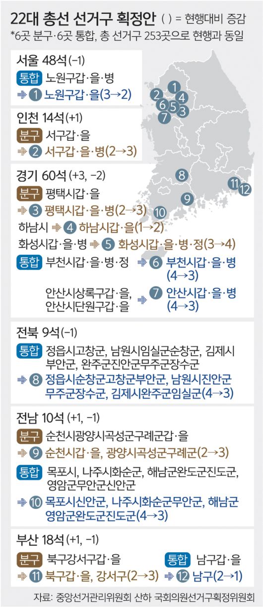 획정안에 따르면 6개 선거구가 통합되고 6개 선거구가 분구된다. 서울은 노원구갑·을·병이 노원구갑·을로 통합되며 1석 줄어든다. 전북에서도 정읍시고창군, 남원시임실군순창군, 김제시부안군, 완주군진안군무주군장수군이 정읍시순창군고창군부안군, 남원시진안군무주군장수군, 김제시완주군임실군으로 조정되며 1석이 줄었다.