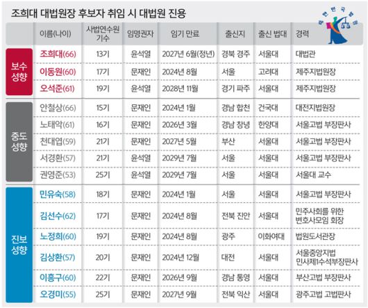 5일 법조계에 따르면 조 후보자가 대법원장에 취임할 경우 임기 중 9명의 대법관이 교체된다. 대법원장 임기는 6년이지만 조 후보자는 3년 6개월 뒤인 2027년 6월 정년(70세)이 도래한다. 그 사이 안철상·민유숙·김선수·노정희·이동원·김상환·노태악·이흥구·천대엽 대법관이 퇴임하는데 이 중 진보성향으로 분류되는 대법관은 과반인 5명(민유숙·김선수·노정희·김상환·이흥구)이다.