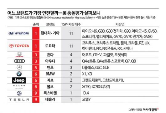 올해 IIHS 충돌 평가(한국 출시 차량 한정)를 살펴보면 가장 안전한 차에 주어지는 등급(톱 세이프티 픽 플러스·TSP+)를 가장 많이 받은 제조사는 현대차·기아와 도요타(렉서스 포함)다. 양사는 11개 차량이 TSP+ 등급을 받았다. 뒤이어 혼다·아우디(4개), 메르세데스 벤츠(3개)가 뒤를 이었다. BMW, 지프, 볼보는 2개 차량이 TSP+등급을 받았으며 테슬라와 폭스바겐은 1개를 받았다.