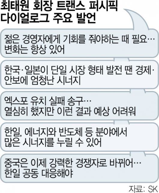 안보 측면에서도 최 회장은 “한국과 일본이 강력한 경제 동맹을 맺어 큰 시장으로 성장한다면 주변국인 중국과 러시아도 동참할 수 있는 기회를 만들게 돼 결국은 북한 문제 등 동북아 전체에 평화를 가져올 수 있다”고 전망했다.