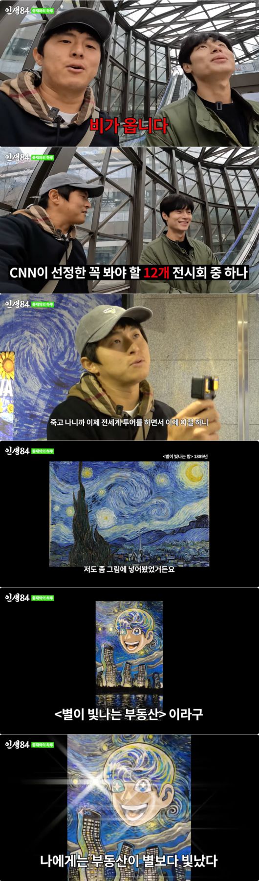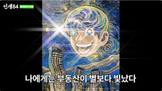 반 고흐의 ‘별이 빛나는 밤’을 본 기안84는 “저도 이 그림 좋아해서 저도 그림에 넣어봤다. ‘별이 빛나는 부동산’이라고. 나에게는 부동산이 별보다 빛났다. 저도 영감을 받았다”라고 설명했다.