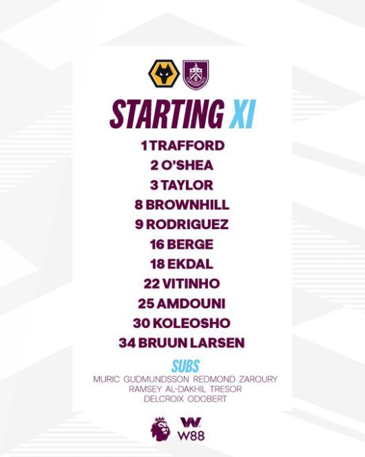 원정 팀 번리는 4-4-2 전형으로 맞섰다. 제임스 트래포드가 골키퍼 장갑을 꼈고 찰리 테일러, 얄마르 에크달, 다라 오셰이, 비티뉴가 백4를 구성했다. 루카 콜레오쇼, 조시 브라운힐, 산데르 베르게, 야콥 브룬 라르센이 중원을 이뤘으며 제키 암도우니가 제이 로드리게스와 최전방 투톱으로 호흡을 맞췄다.