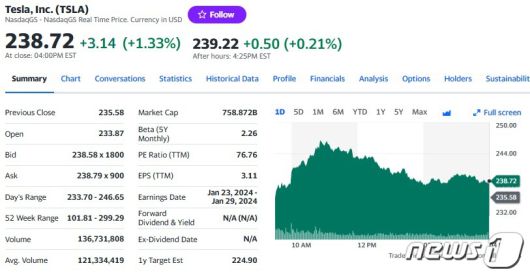 그러나 미국 전기차의 간판 테슬라는 중국 판매 증가와 사이버트럭 후광 효과로 1% 이상 상승했다. 이날 테슬라는 전거래일보다 1.33% 상승한 238.72 달러를 기록했다.