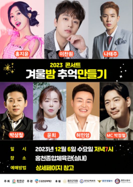 홍천문화재단이 개최하는 기획공연인 이번 '2023 연말 콘서트'는 12월 6일 수요일 저녁 7시 홍천종합체육관(실내)에서 진행된다.
