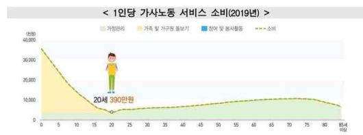 가사노동 서비스를 소비하는 연령대는 0세가 1인당 3638만원으로 가장 많았고, 성년이 되는 20세가 390만원으로 가장 낮았다.