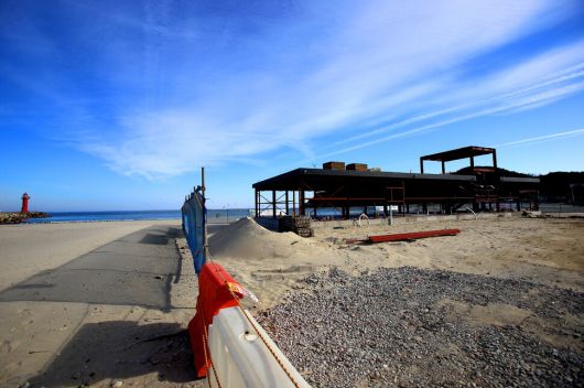 강원도 양양군 설악해수욕장 백사장에 짓고 있는 건물 모습. 이 건물에는 음식점과 소매점, 공연장 등이 들어설 예정이다. 모래 유실로 사실상 해변 기능을 잃어가고 있는 남쪽을 제외한 북쪽 해변 백사장의 상당 부분을 이 건물이 차지하고 있다. 박수혁 기자 |
