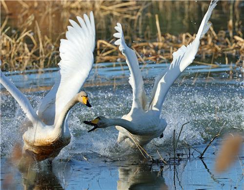 처음 5∼7마리가 있던 고니가 한때 50여 마리까지 늘어나자 가족 단위로 생활하는 고니들이 먹이 공간을 사수하거나 빼앗기 위해 싸움에 나서는 것이다.