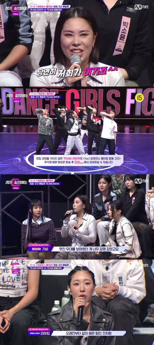 이날 팀 라치카와 팀 원밀리언이 세븐틴 곡으로 첫 대결의 포문을 열어 시선을 사로잡았다. 라치카 마스터 가비는 "당연히 저희가 이긴다"라며 강한 자신감을 내비쳤고, 원밀리언 마스터 리아킴도 "원밀리언이 이긴다"라며 지지 않는 모습을 보였다.