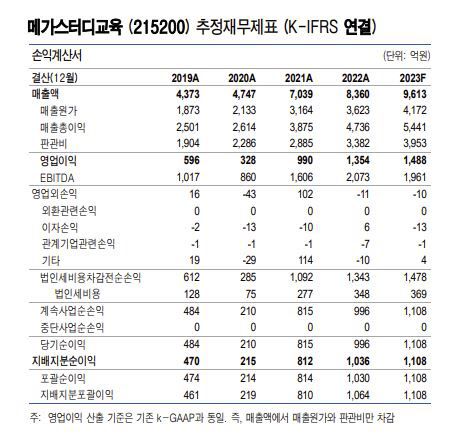 권명준 유안타증권 연구원에 따르면 메가스터디교육의 3분기 실적은 매출액 2610억원으로 전년 동기 대비 12.1% 늘고, 영업이익은 590억원으로 전년대비 0.3% 늘었다. 학령인구 감소로 인한 교육시장 축소 우려에도 매출 성장이 이어지고 있는 셈이다.