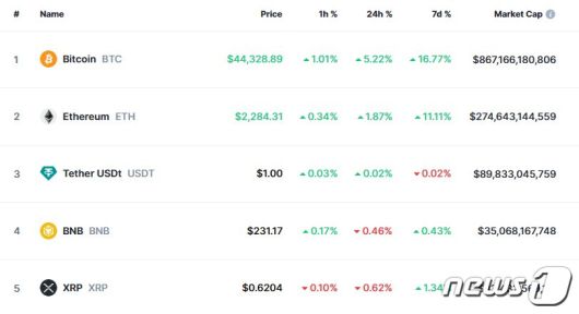 6일 오전 7시 30분 현재 비트코인은 글로벌 코인시황 중계사이트인 코인마켓캡에서 24시간 전보다 5.22% 급등한 4만4328 달러를 기록하고 있다.
