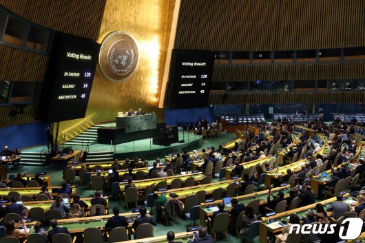 27일(현지시간) 유엔이 이스라엘과 팔레스타인 무장정파 하마스를 향해 즉각적인 휴전을 촉구하는 결의안을 찬성 120표, 반대 14표, 기권 45표로 채택했다. (사진은 기사 내용과 무관함) / 뉴스1 ⓒ News1 2023.10.27/ ⓒ 로이터=뉴스1 ⓒ News1 박재하 기자 |