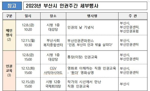 첫날인 8일 오전 10시 20분 시청 대강당에서 박형준 부산시장, 안성민 부산시의회 의장, 인권 단체가 참여하는 '인권의 날 기념식'이 열린다.