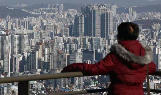 서울 남산을 찾은 시민이 서울 아파트단지를 바라보고 있다./뉴스1 |