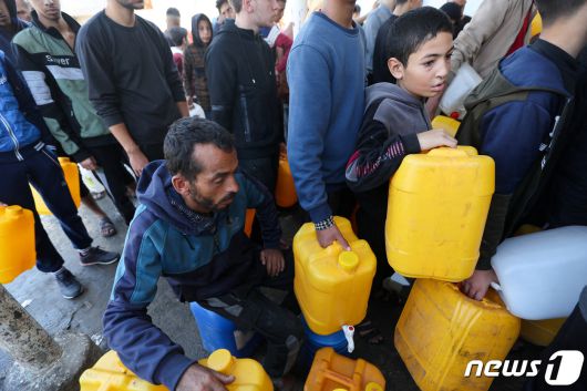 4일(현지시간) 가자지구 남부 칸유니스 지역에서 팔레스타인인들이 물을 담기 위한 통을 들고 줄지어 서고 있다. 2023.12.04 ⓒ 로이터=뉴스1 ⓒ News1 정지윤 기자 |