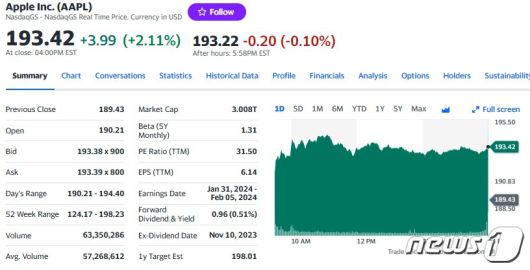 5일(현지시간) 뉴욕증시에서 애플은 전거래일보다 2.11% 급등한 193.42 달러를 기록했다.