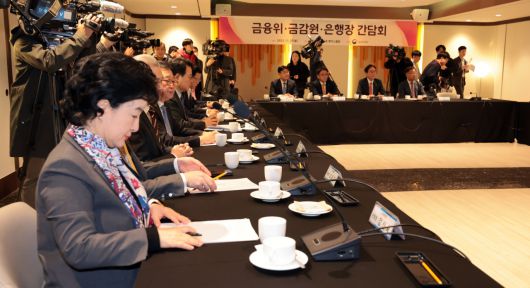 27일 오후 서울 중구 전국은행연합회 뱅커스클럽에서 열린 금융위·금감원·은행장 간담회에서 은행장들이 김주현 금융위원장의 발언을 경청하고 있다. [연합] |