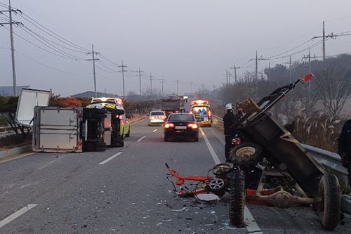 (나주=연합뉴스) 정회성 기자 = 6일 오전 6시 40분께 전남 나주시 산포면 편도 2차로 도로에서 A(50)씨가 몰던 1t 화물차가 주행 중인 B(70)씨의 경운기와 충돌하고 옆으로 넘어졌다.