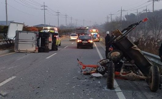 [나주=뉴시스]이영주 기자 = 6일 새벽 6시40분께 전남 나주시 산포면 55번 지방도(남평 방면) 편도 2차선 도로에서 A(49)씨가 몰던 1t 화물차가 앞서가던 B(70)씨의 경운기를 들이받았다.