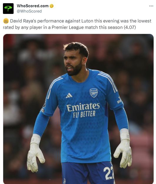 축구통계매체 '후스코어드'는 6일(한국시간) "데이비드 라야는 이날 저녁 루턴 타운을 상대로 기록한 평점(4.07)은 올시즌 프리미어리그 경기에서 뛴 모든 선수 중 가장 낮은 점수이다"라고 전했다.
