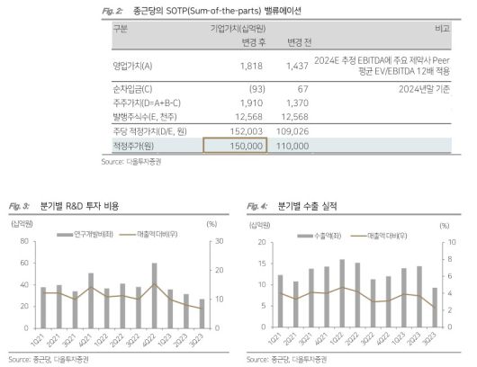 다올투자증권은 6일 종근당에 대해 노바티스와의 HDAC6 저해제 CKD-510 기술이전 계약 체결 후 신약 가치를 반영할 계획으로 R&D 비용 증가에도 견조한 실적이 예상된다며 투자의견 매수를 유지하고 목표주가를 기존 11만 원에서 15만 원으로 36.36% 상향 조정했다. 전 거래일 기준 현재 주가는 12만6200원이다.