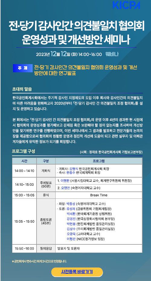 [서울=뉴시스]우연수 기자 = 한국공인회계사회는 오는 12일 '전·당기 감사인 간 의견불일치 조정협의회 운영 성과 및 개선 방안 세미나'를 연다고 6일 밝혔다.