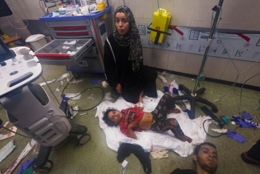 5일(현지시간) 가자지구 남부 칸 유니스 동쪽 마안 학교에 대한 이스라엘 방위군(IDF)의 공습으로 부상당한 나세르 병원 바닥에 누워 있다./로이터·연합뉴스 |