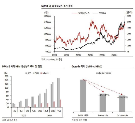 SK증권은 6일 반도체 업종에 대해 비중확대 의견을 제시하며 "HBM 관점에서 AI 센티먼트 악화는 부정적일 수 있지만, AI칩의 HBM 요구 용량 증가와 GPU 업계 외 시장 참여, HBM 공급자들의 거래선 다변화 등을 감안하면 메모리업계의 AI를 통한 펀더멘털의 강화 포인트는 변하지 않았다"고 평가했다.