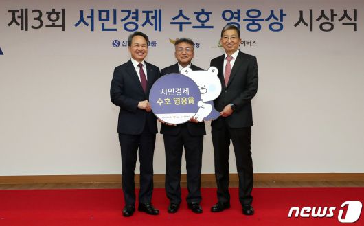 (서울=뉴스1) 박세연 기자 = 우종수 국가수사본부장(오른쪽)과 진옥동 신한금융지주 회장(왼쪽)이 지난 5일 오후 서울 종로구 경찰청에서 열린 제3회 서민경제 수호 영웅상 시상식에서 수상자 택시기사 송승선씨와 기념촬영을 하고 있다. 2023.12.6/뉴스1