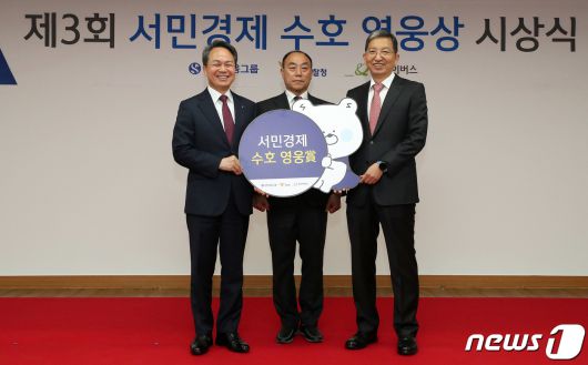 (서울=뉴스1) 박세연 기자 = 우종수 국가수사본부장(오른쪽)과 진옥동 신한금융지주 회장(왼쪽)이 지난 5일 오후 서울 종로구 경찰청에서 열린 제3회 서민경제 수호 영웅상 시상식에서 수상자 광주서부서 지능3팀 강평활 경감과 기념촬영을 하고 있다. 2023.12.6/뉴스1