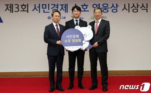 (서울=뉴스1) 박세연 기자 = 우종수 국가수사본부장(오른쪽)과 진옥동 신한금융지주 회장(왼쪽)이 지난 5일 오후 서울 종로구 경찰청에서 열린 제3회 서민경제 수호 영웅상 시상식에서 수상자 부산 강수대 강상우 경위와 기념촬영을 하고 있다. 2023.12.6/뉴스1