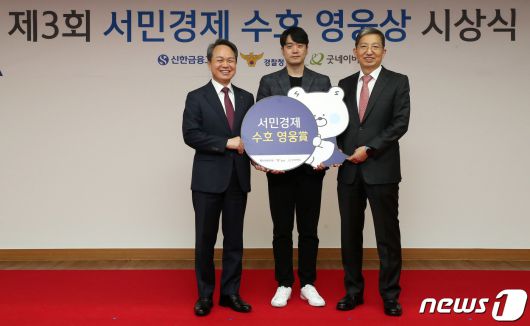 (서울=뉴스1) 박세연 기자 = 우종수 국가수사본부장(오른쪽)과 진옥동 신한금융지주 회장(왼쪽)이 지난 5일 오후 서울 종로구 경찰청에서 열린 제3회 서민경제 수호 영웅상 시상식에서 수상자 전 코인원거래소 센터장 이찬형씨와 기념촬영을 하고 있다. 2023.12.6/뉴스1