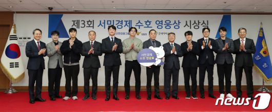 (서울=뉴스1) 박세연 기자 = 우종수 국가수사본부장(오른쪽)과 진옥동 신한금융지주 회장(왼쪽)이 지난 5일 오후 서울 종로구 경찰청에서 열린 제3회 서민경제 수호 영웅상 시상식에서 수상자들과 기념촬영을 하고 있다. 왼쪽부터 우종수 수사본부장, 박승율 경사, 변종윤 경사, 강평활 경감, 강상우 경위, 박경수 경위, 양용욱, 송승선, 김정훈, 김재운, 이찬형, 진옥동 신한금융지주 회장. 2023.12.6/뉴스1