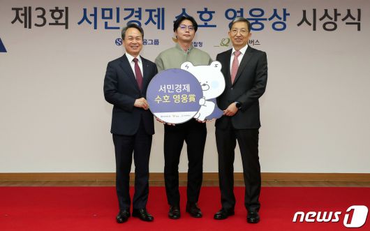 (서울=뉴스1) 박세연 기자 = 우종수 국가수사본부장(오른쪽)과 진옥동 신한금융지주 회장(왼쪽)이 5일 오후 서울 종로구 경찰청에서 열린 제3회 서민경제 수호 영웅상 시상식에서 수상자 서울 강수대 박경수 경위와 기념촬영을 하고 있다. 2023.12.6/뉴스1