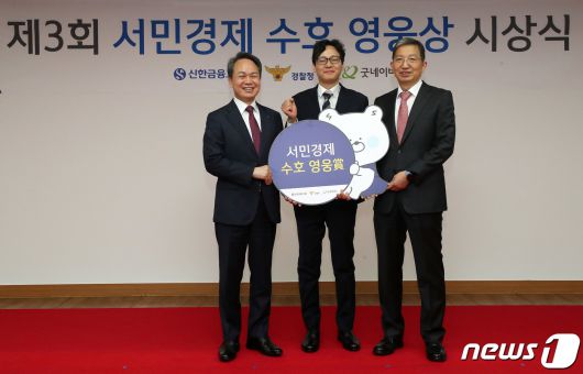 (서울=뉴스1) 박세연 기자 = 우종수 국가수사본부장(오른쪽)과 진옥동 신한금융지주 회장(왼쪽)이 지난 5일 오후 서울 종로구 경찰청에서 열린 제3회 서민경제 수호 영웅상 시상식에서 수상자 세계로병원 시설 관리팀장 김재운씨와 기념촬영을 하고 있다. 2023.12.6/뉴스1